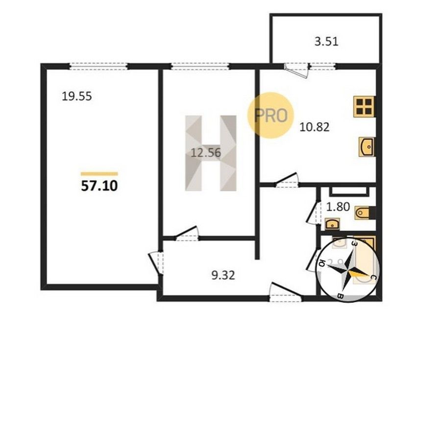 2 комнаты, от 55.6м